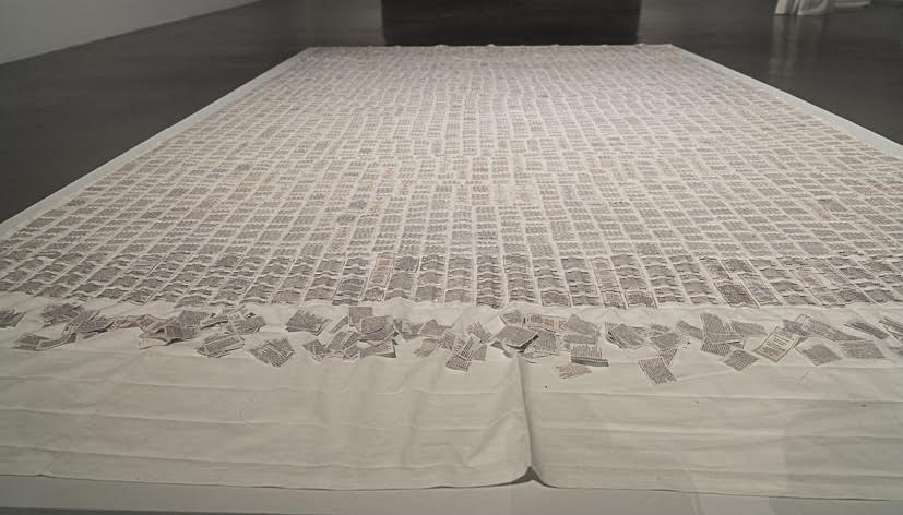 I collected the death notices printed in the newspaper and printed them onto fabric. I then stitched them onto a sheet, every day from October 2015 to September 2016. This simple act of stitching removed any anxiety I was feeling about the written work, and served as a calming and therapeutic activity which made me feel so much better in myself. Just being with the fabric and threads in peace and quiet helped me to immerse myself in the work, and focus just on the movement of the needle and thread. Sometimes I would allow myself a whole weekend of stitching to get away from the writing, editing and the associated stress.